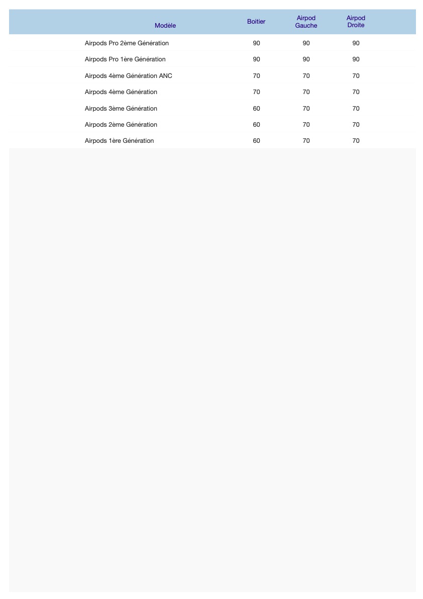 En cas d'échec d'un ou plusieurs de ces diagnostiques, nous vous proposerons de remplacer la ou les pièces posant problème. Une fois la ou les pièces remplacée, nous ferons à nouveau tout les tests afin de s'assurer que vous récupérez des AirPods en parfait état de fonctionnement.