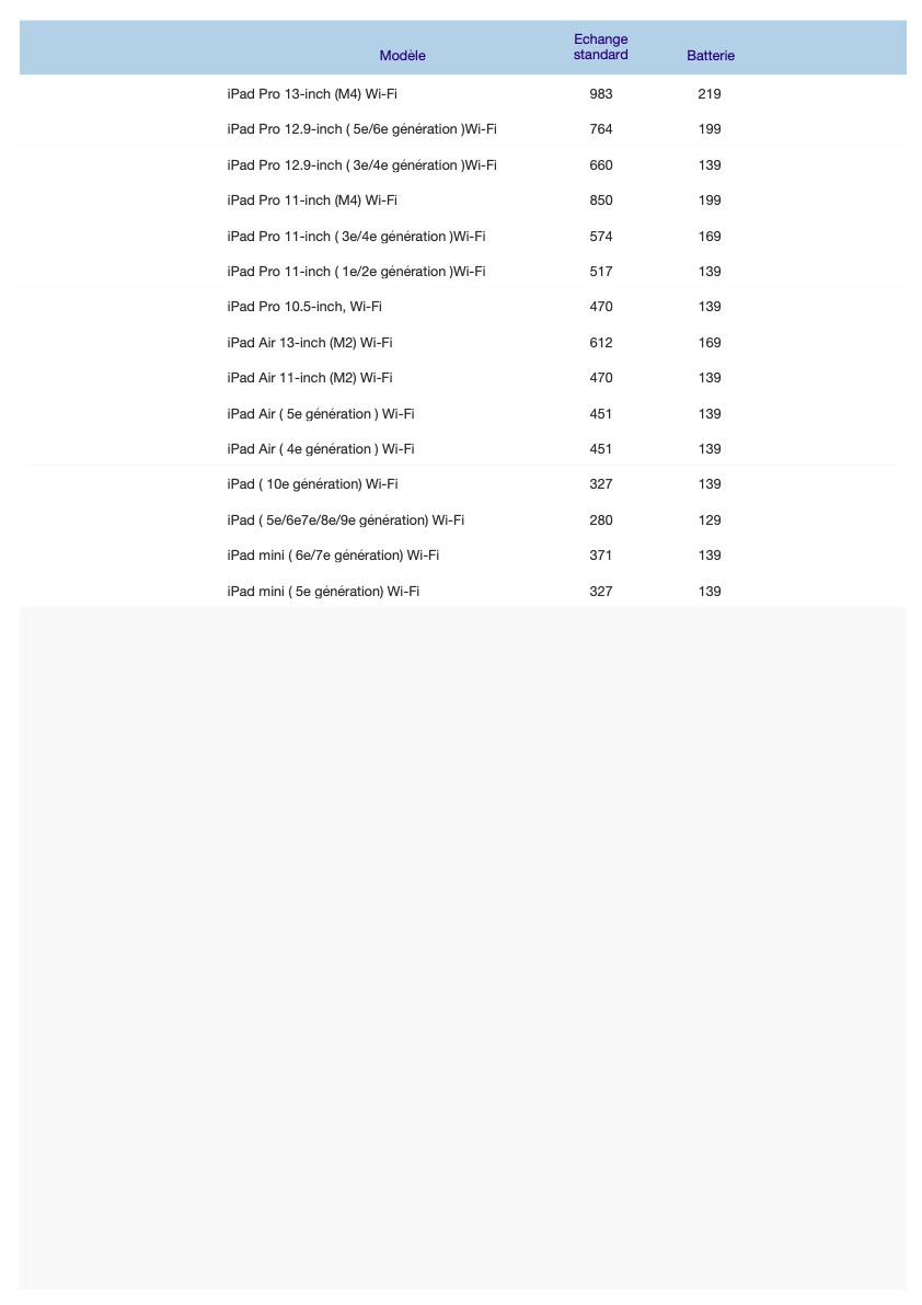Les réparations iPad se compose uniquement d'échange standard à des prix forfaitaires en deux catégories. tarif pour un problème de batterie uniquement et tarif pour tout autre problème.